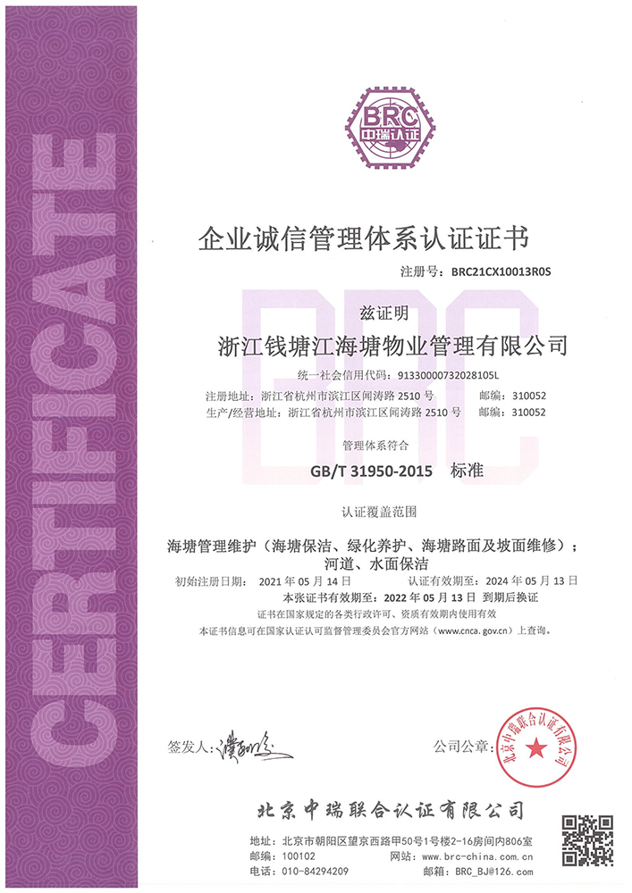 誠信管理體系認(rèn)證證書